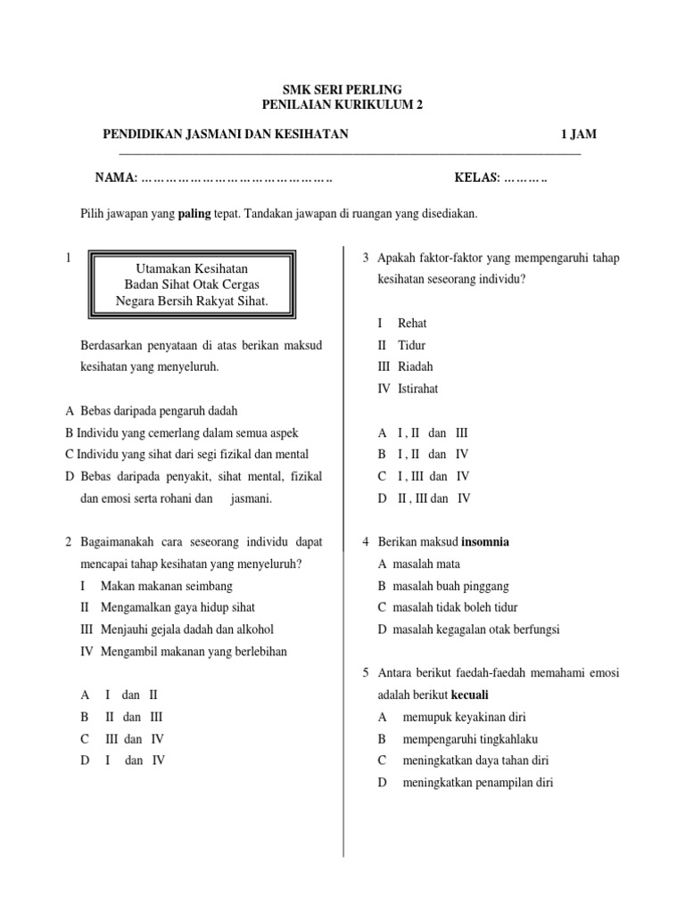 Sekiranya ya, di bawah dikongsikan nota pendidikan islam tingkatan 4 (lengkap) kssm untuk rujukan keseimbangan (memenuhi keperluan rohani, jasmani dan akal secara ssempurna dalam semua. Bank soalan pendidikan jasmani & pendidikan kesihatan (pjpk) tingkatan 5. Pendidikan jasmani, olahraga, dan kesehatan. Sumber pendidikan > kokurikulum > kertas ujian > ujian mac pendidikan jasmani kesihatan tingkatan 4. Pelaksanaan kssm bagi sekolah menengah tingkatan 4 dan 5.