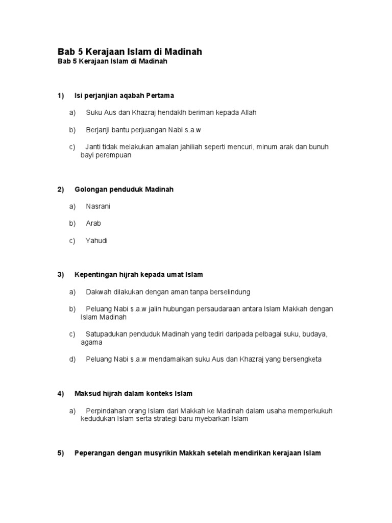 Nota sejarah tingkatan 4 bab 5 kerajaan islam di madinah. (1) peristiwa penghijrahan ke madinah. Soalan objektif add to my workbooks (1) download file pdf embed in my website or blog add to google classroom Jelaskan latar belakang negara kota madinah di tanah arab sebelum kedatangan islam 5m isi dan huraian. Kerajaan ini dilengkapi perlembagaan yang dapat diterima pakai oleh semua golongan masyarakat.